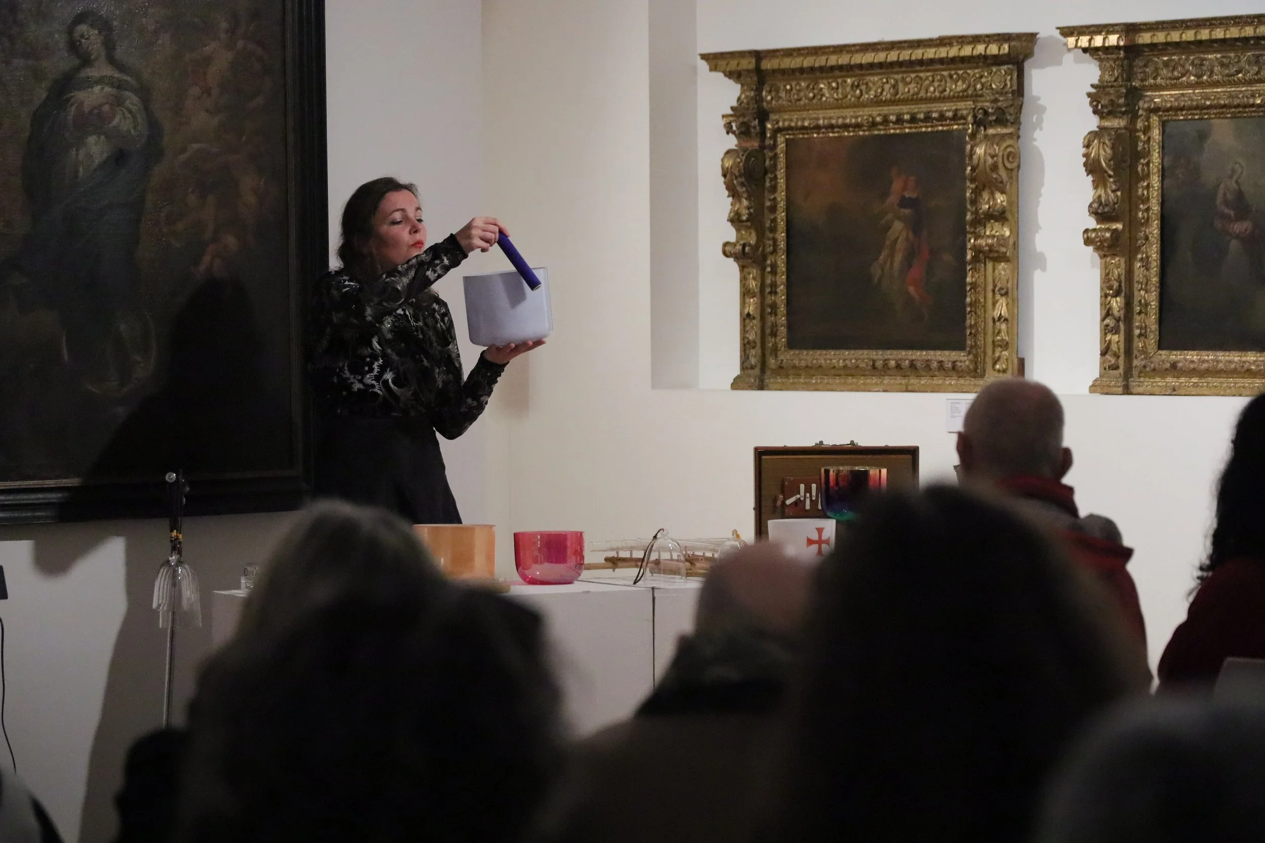 Taças, harpas e sinos de cristal, e outros instrumentos com uma sonoridade de cariz meditativo abrem no ouvinte uma percepção do espaço distinta, profunda e reveladora. O som é musical mas transcende a ideia musical, vai ao princípio, à inteligência que vibra no elemento, no mineral, na cor ou na forma. O convite é pois entrar em contacto com a dimensão da fisicalidade sem conceito, aquela que fala diretamente ao artista sempre que ele se debate com a tela em branco. O convite é pois entrar em contacto com o pensamento que se esvazia para dar lugar à arte intimista, sensorial e senciente.